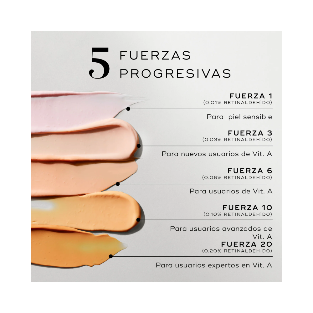 Usar en noches alternas y aumentar progresión según tolerancia. Aplicar una pequeña cantidad por todo el rostro. Evitar el contorno del ojo, excepto la pata de gallo.