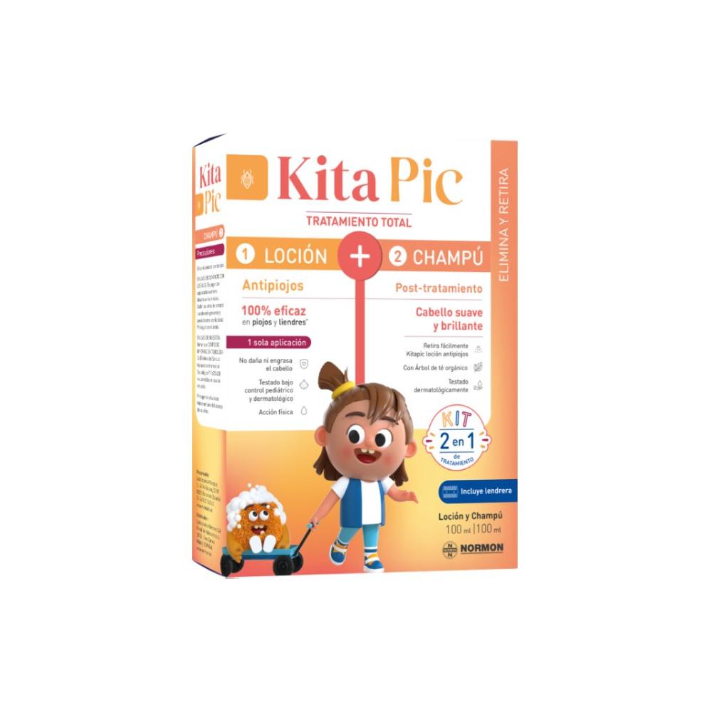 Kitapic Kit Total está compuesto por Kitapic Loción Antipiojos y Kitapic Champú Post-Tratamiento. Kitapic Loción Antipiojos es 100% eficaz frente a piojos y liendres en una sola aplicación. Kitapic Champú Post-Tratamiento con Árbol de té orgánico de uso diario de doble acción, protege e hidrata el cabello facilitando su peinado.